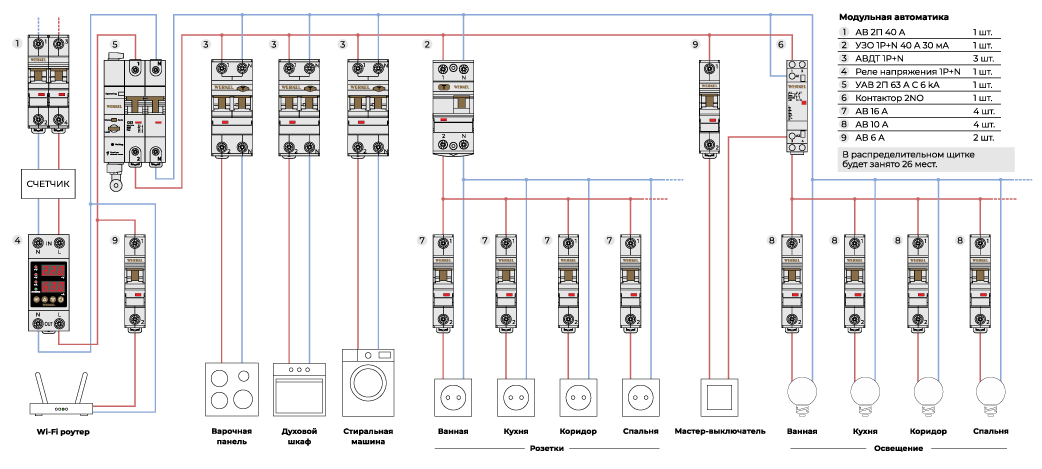 * Схема не является руководством для монтажа. В каждом случае должна разрабатываться профессиональным электриком индивидуально. Заземляющий провод опущен для простоты восприятия.